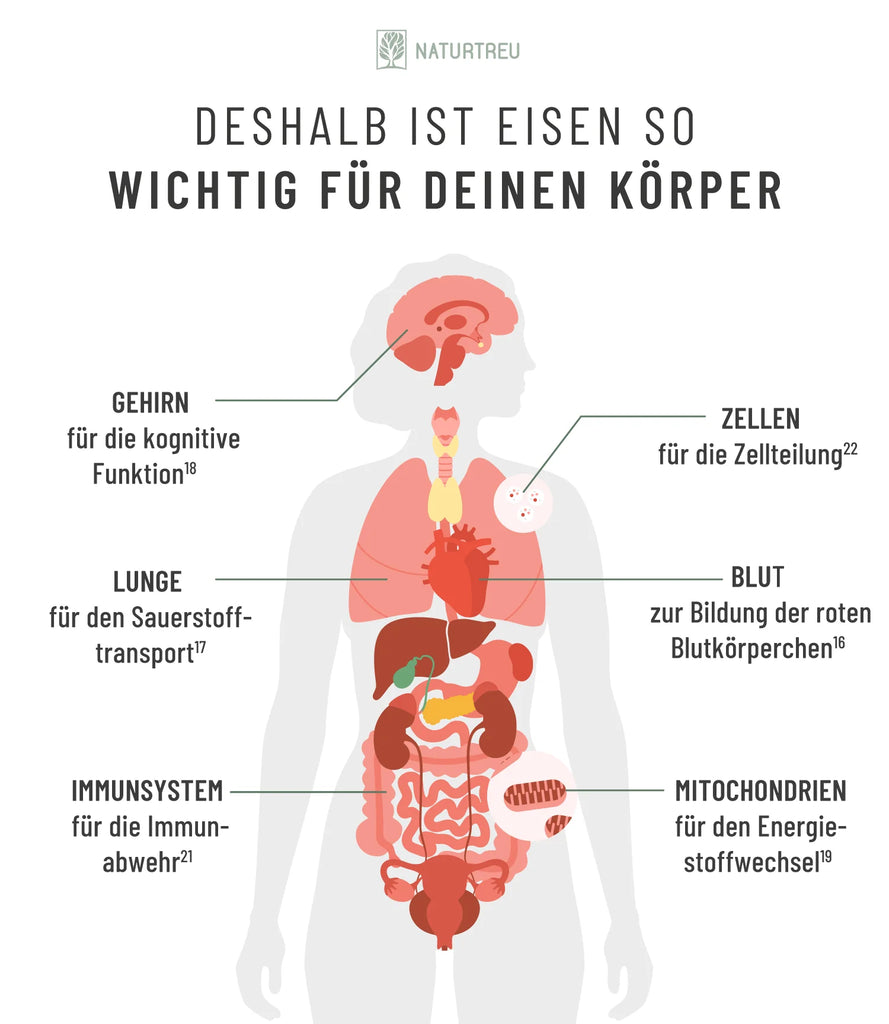 Die Liste könnte noch endlos weitergeführt werden. Schließlich sind all deine Zellen auf die Versorgung mit Sauerstoff angewiesen¹²! Die damit verbundenen Prozesse können nicht reibungslos ablaufen, wenn deinem Körper zu wenig Eisen zur Verfügung steht.
