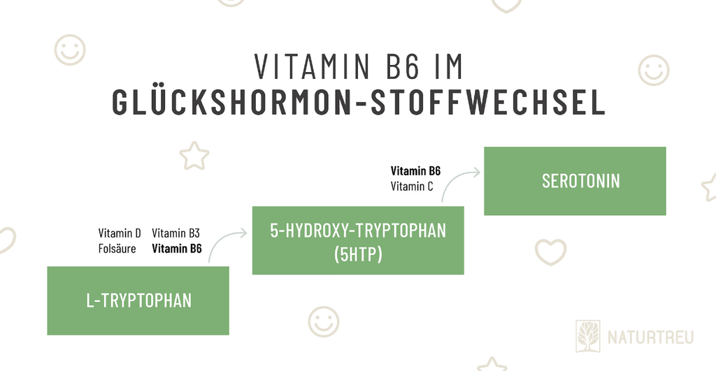 Fehlt dem Körper Vitamin B6, kann er auch kein Serotonin produzieren, weil Vitamin B6 als Katalysator für die Umwandlung von Tryptophan – und im weiteren Verlauf von 5 HTP – in Serotonin agiert.