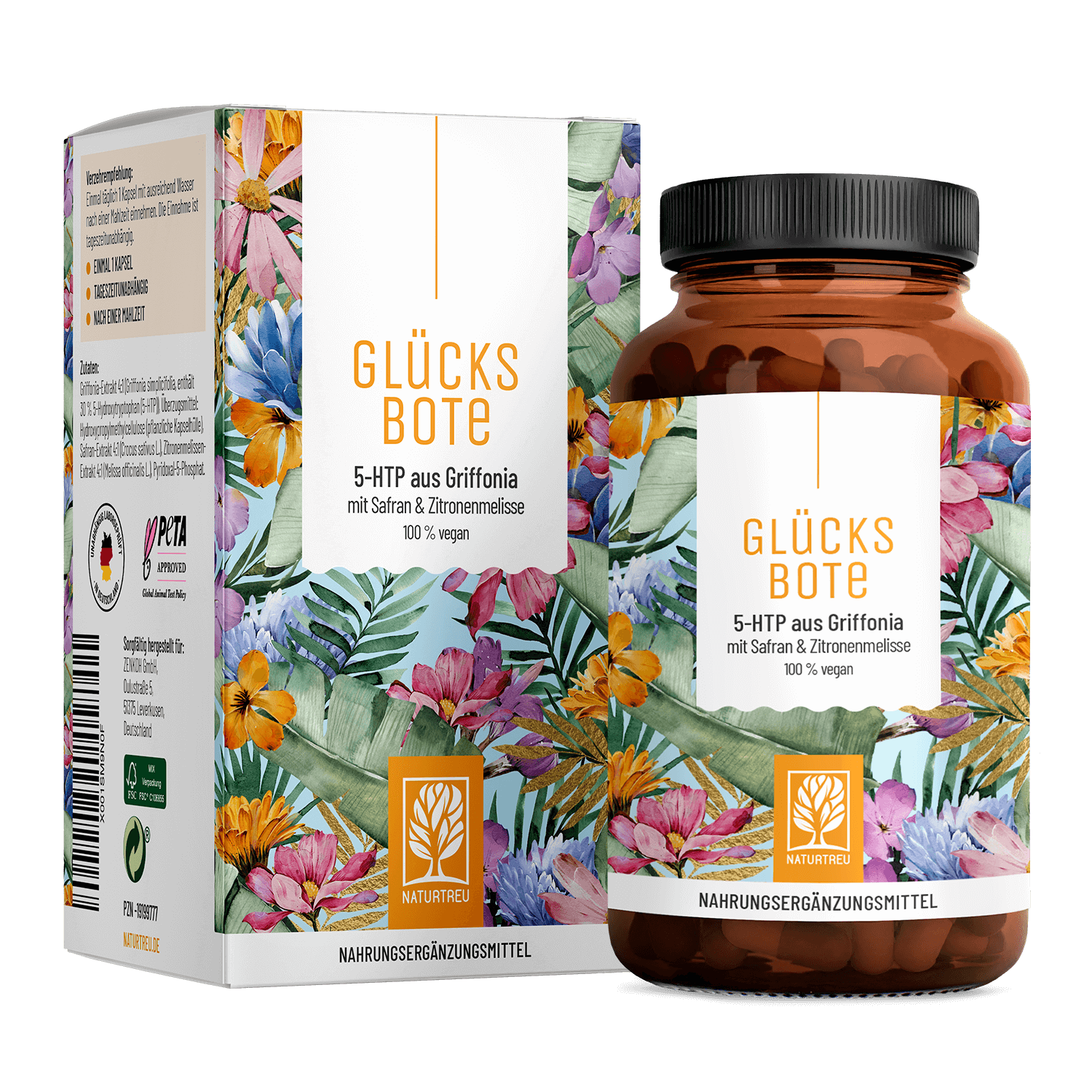 Unser NATURTREU GLÜCKSBOTE nimmt dich in der dunklen Jahreszeit an die Hand und liefert dir ganze 100 mg 5 HTP aus exklusivem Griffonia Extrakt.