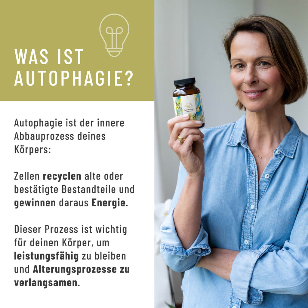 Mit zunehmendem Alter lässt die Autophagie-Aktivität nach. Spermidin wird in der Forschung als natürlicher Impulsgeber für diesen Prozess beschrieben – weshalb es im Zusammenhang mit Longevity, also der Langlebigkeit, und Healthy Aging eine zentrale Rolle spielt.