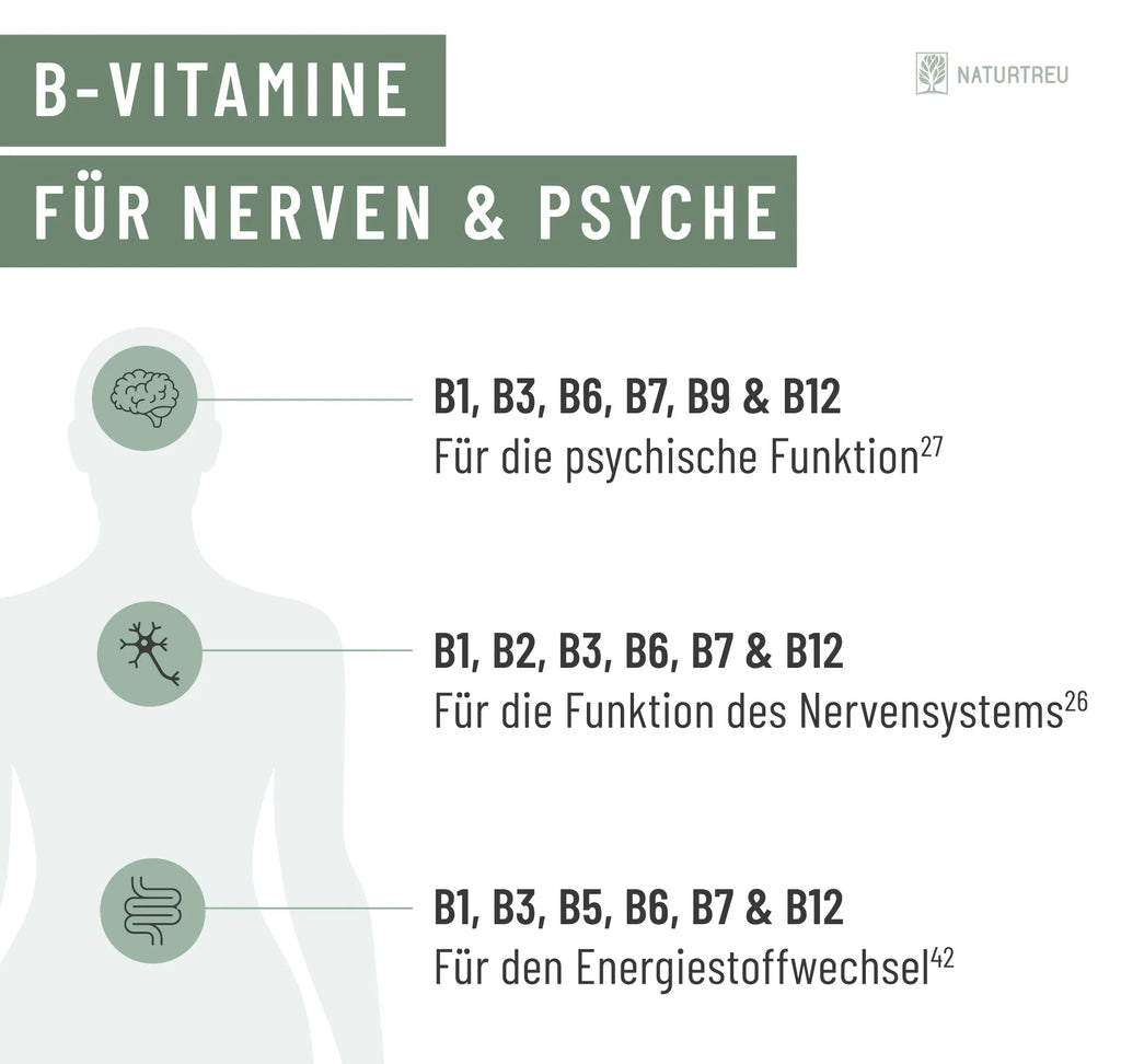 - B-Vitamine für den Energiestoffwechsel⁴², das Nervensystem²⁶ und die psychische Funktion²⁷