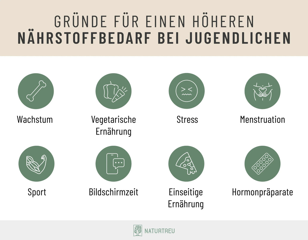 Hinzu kommen Phasen des schnellen Wachstums, in denen der Körper schlichtweg mehr Nährstoffe braucht. Auch in Zeiten intensiver körperlicher oder geistiger Belastung, zum Beispiel vor Prüfungen oder bei viel Sport, haben Jugendliche unter Umständen einen höheren Nährstoffbedarf³⁷.