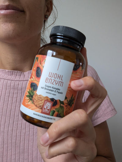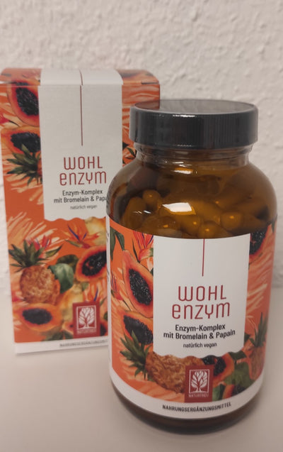 WOHLENZYM ist eine erlesene Spezialanfertigung, welche neben den beiden Enzymen Bromelain und Papain noch das Flavonoid Rutin und wertvolles Selen beinhaltet. Das Spurenelement sorgt in dieser einzigartigen Zusammenstellung für eine normale Funktion des Immunsystems¹ und trägt darüber hinaus dazu bei, die Zellen vor oxidativem Stress zu schützen⁸.