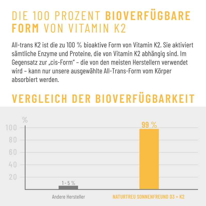 "Ich nehme den Vitamin D3 K2 Komplex von Na-turtreu jetzt seit etwa zwei Monaten und bin absolut begeistert! Was mir besonders wichtig war, ist die Verträglich-keit, da ich oft empfindlich auf Nahrungsergän-zungsmittel rea-giere. Aber dieses Produkt hat mich positiv überrascht.”