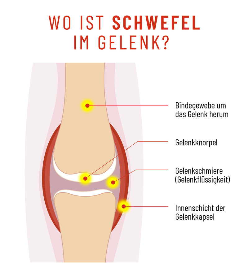 Da die Gelenke ständiger Belastung durch den Alltag ausgesetzt sind, finden hier regelmäßig Reparaturprozesse statt, sodass die Gelenke weiterhin reibungslos funktionieren können¹⁶. Fehlt dem Körper nun allerdings an wichtigen Bausteinen, wie z. B. Schwefel, können diese Reparaturprozesse nicht vollständig ablaufen¹⁷. Dies kann die Funktion des Gelenkes beeinträchtigen und sich dann über die Zeit in Gelenkbeschwerden zeigen.