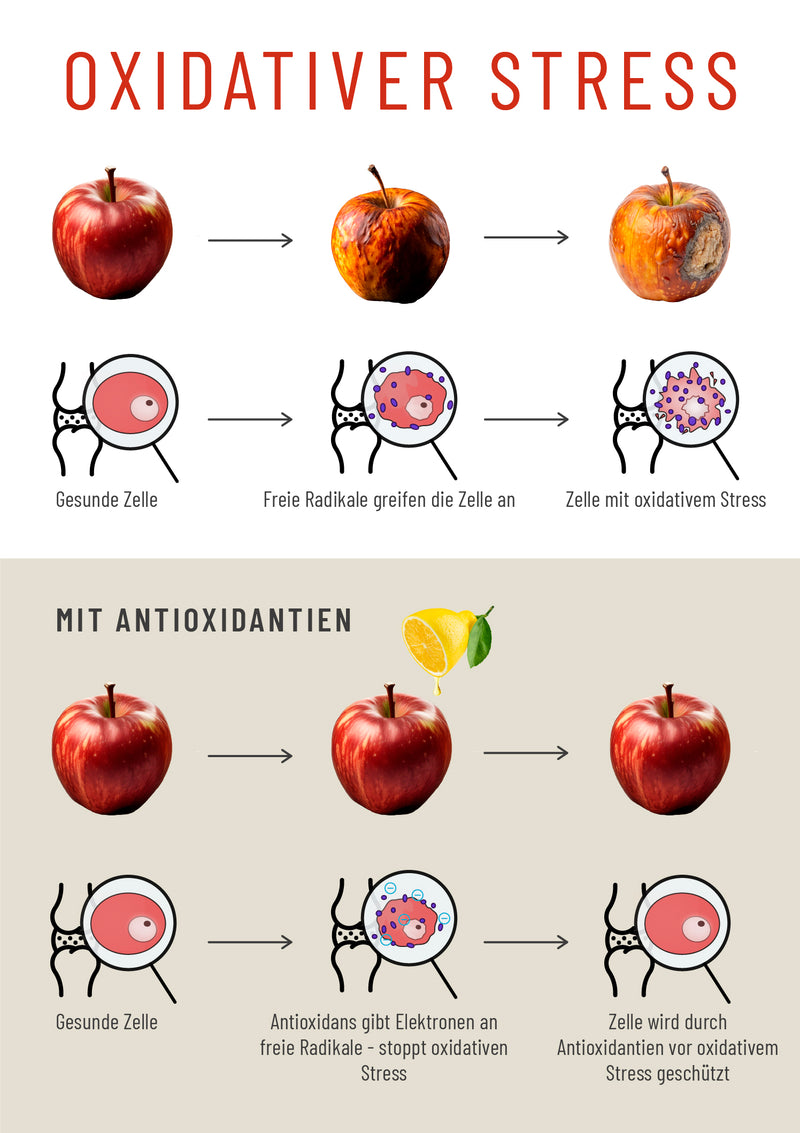 Vitamin C fungiert hier als Antioxidans, das freie Radikale neutralisiert, bevor diese die Zellen schädigen können, und unterbricht so den schädlichen Prozess des oxidativen Stresses².