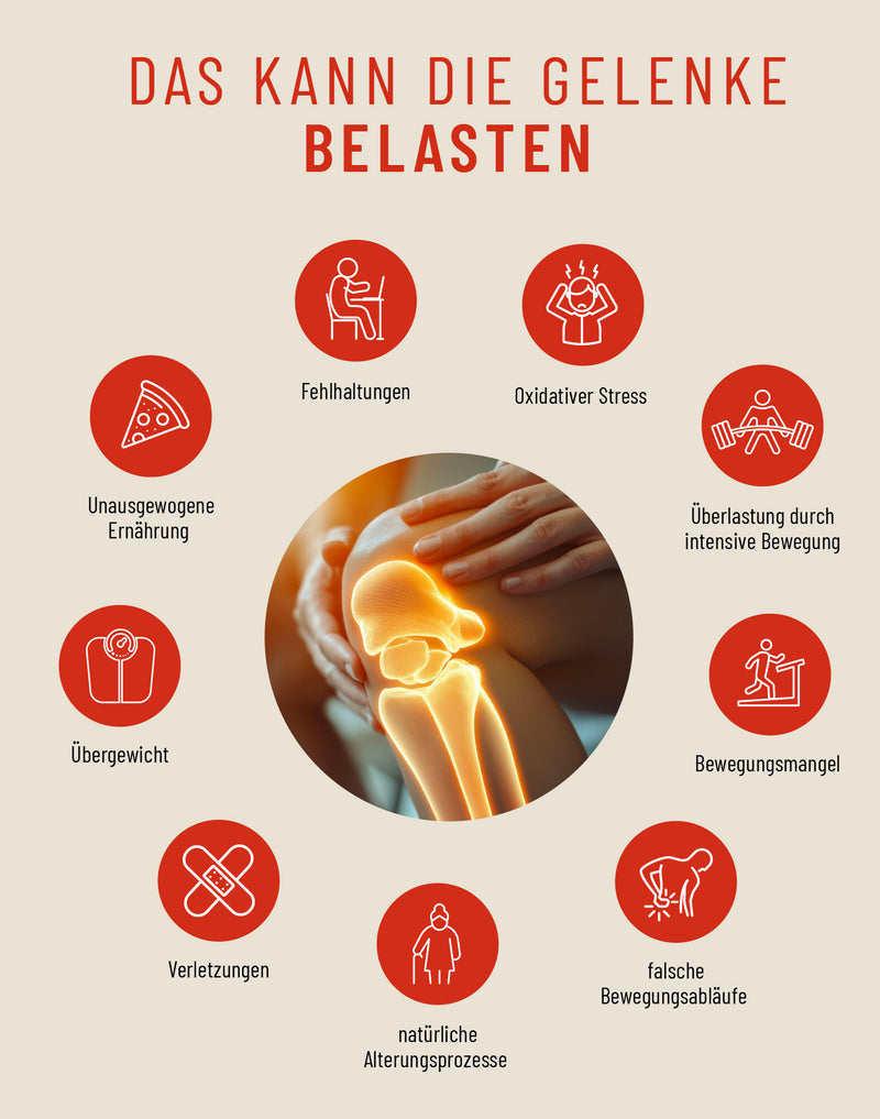 Unsere Gelenke sind jeden Tag unterschiedlichsten Belastungen ausgesetzt. Einige davon sind unvermeidbar, wie die normale Abnutzung im Laufe des Lebens. Andere hingegen entstehen beispielsweise durch unseren Lebensstil und können die Gelenke dauerhaft beeinträchtigen.
