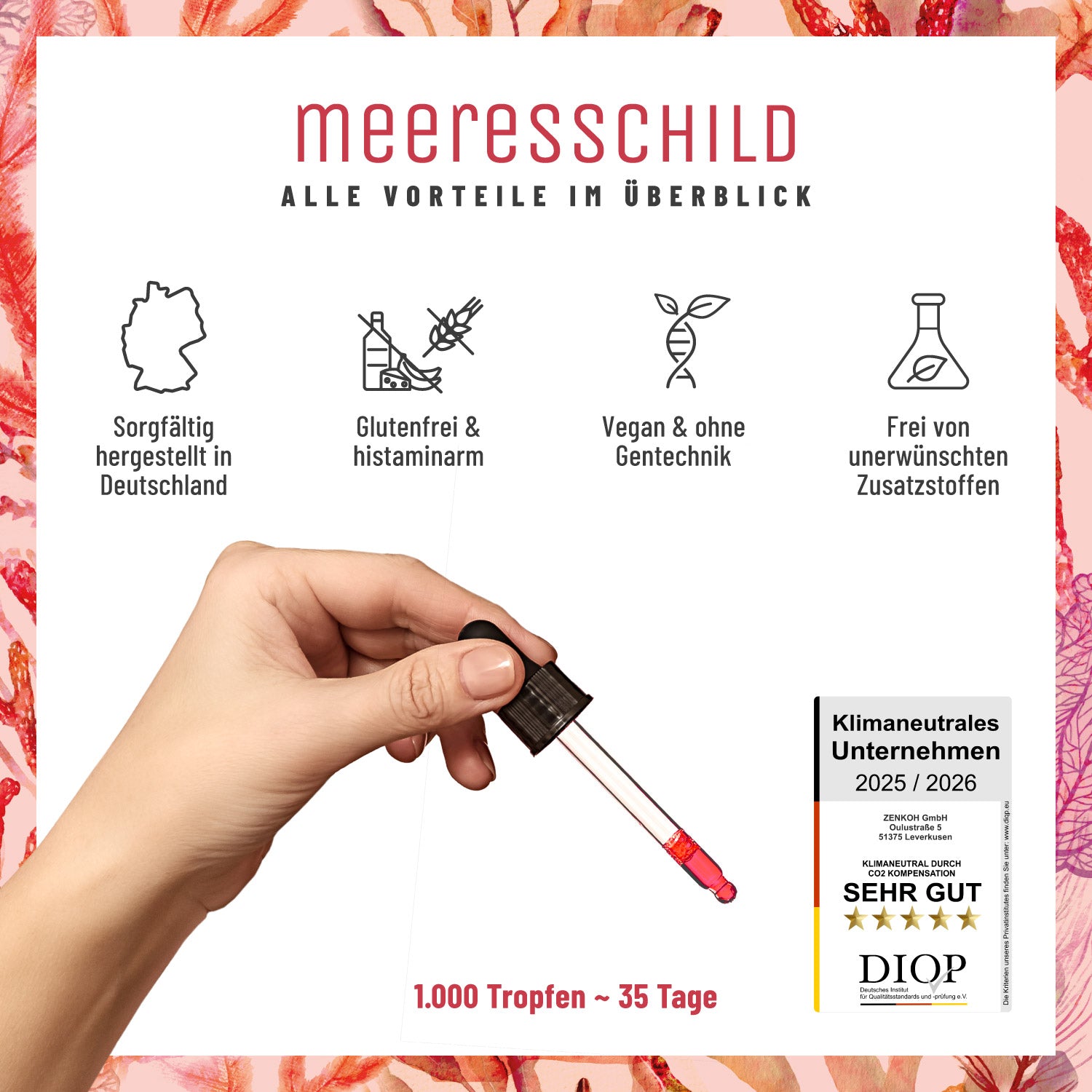 Ein weiterer Vorteil von MEERESSCHILD ist seine Langlebigkeit: Eine Flasche enthält 1.000 Tropfen. Zudem bestehen die Tropfen aus einer besonders reinen Formulierung, die ausschließlich Astaxanthin und wertvolles MCT-Öl enthält.