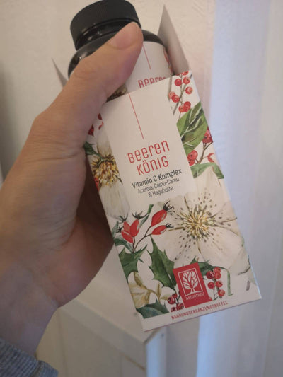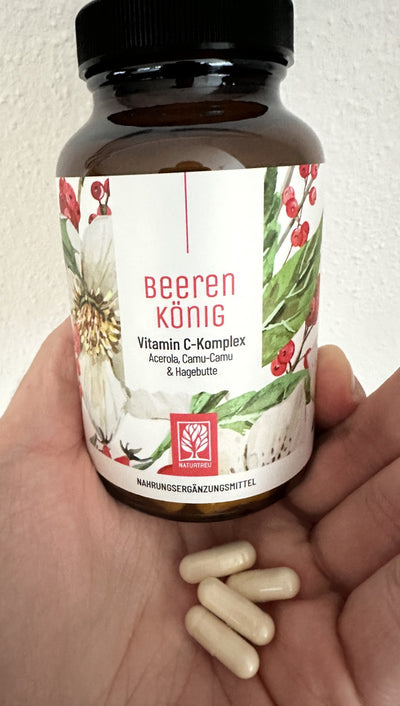 BEERENKÖNIG kombiniert drei natürliche Vitamin C-Quellen in einem hochwertigen Vitamin C-Komplex: Die Acerola-Kirsche, die Camu-Camu-Frucht und die Hagebutte sind bekannt für ihren außerordentlich hohen Vitamin-C-Gehalt. Gemeinsam mit gepufferten Vitamin C⁹ sorgen sie für eine hohe Dosierung von 304 mg Vitamin C je Kapsel.