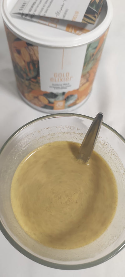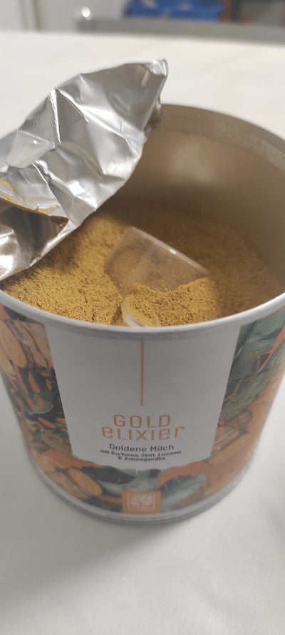 Wir haben unser GOLDELIXIER auf Basis dieser Tradition kreiert und vereinen in unserem Pulver eine abgestimmte Mischung aus Kurkuma, Ashwagandha, Zimt und schwarzem Pfeffer, sorgfältig kombiniert mit Kokosnussmilchpulver, Lucuma und Vanillearoma.