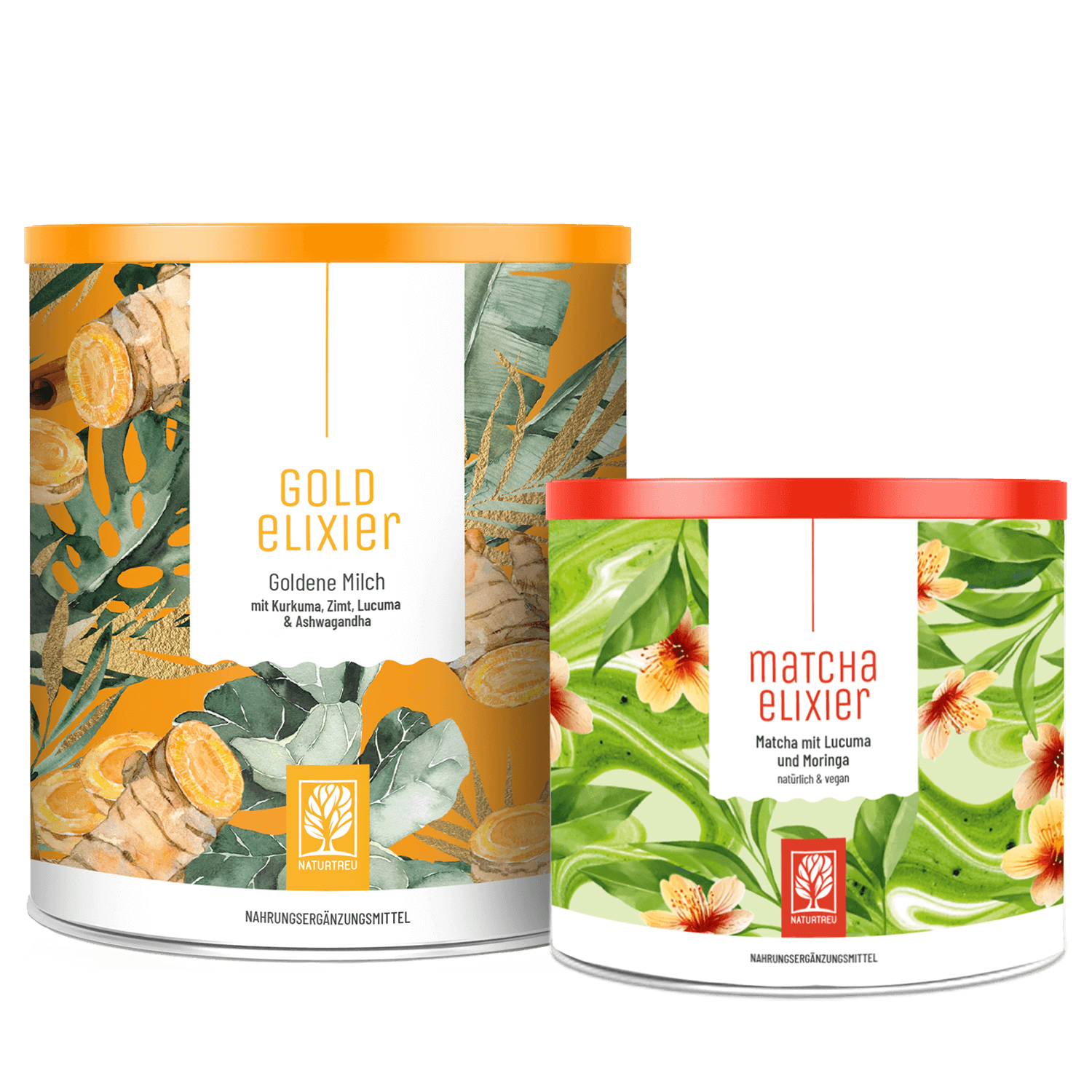 Mit unserem Elixier Duo holst du dir zwei besondere Rituale nach Hause: MATCHAELIXIER für einen bewussten Start in den Tag und GOLDELIXIER für wohltuende Momente der Ruhe.