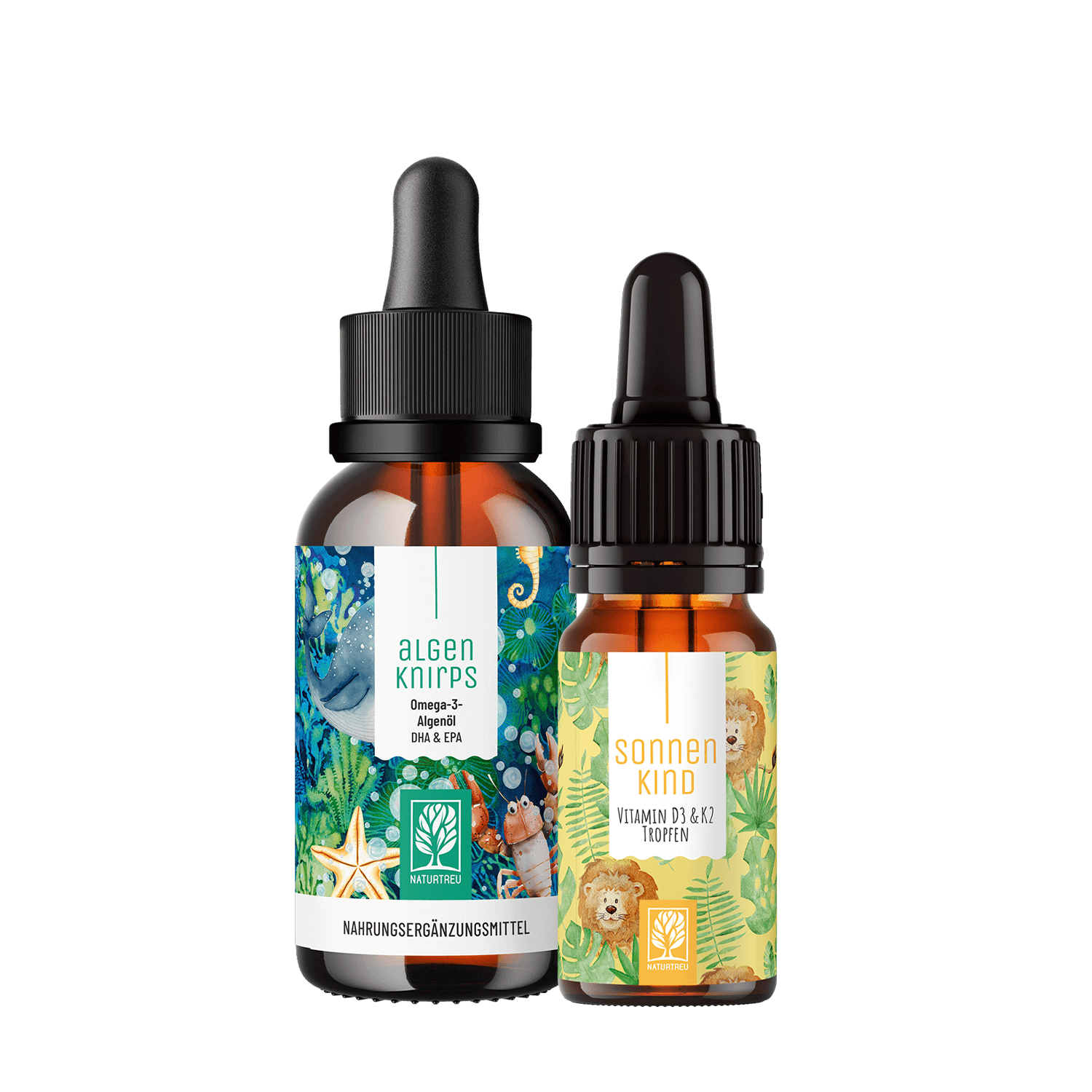 ALGENKNIRPS und SONNENKIND sind speziell für Kinder ab vier Jahren geeignet. Selbstverständlich können auch Erwachsene die Tropfen einnehmen, etwa wenn das Schlucken von Kapseln Schwierigkeiten bereitet.