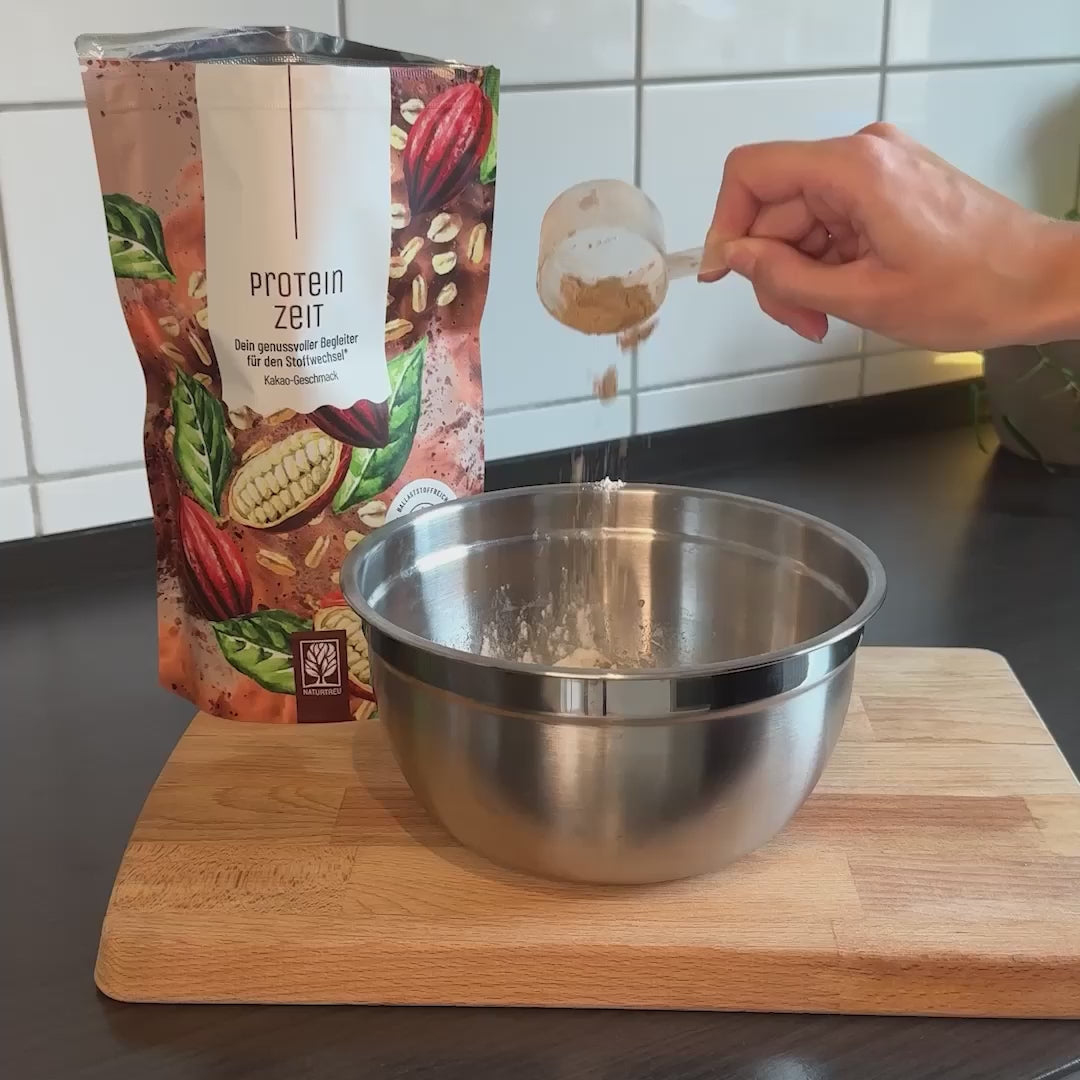 Proteinzeit ist dein Stoffwechsel¹-Shake und Protein-”Allrounder” in einem Produkt. Unser Pulver ergänzt deine Ernährung auf einfache Weise mit hochwertigen Proteinen, ist ballaststoffreich und unterstützt dank ausgewählter Vitamine deinen Stoffwechsel¹'².