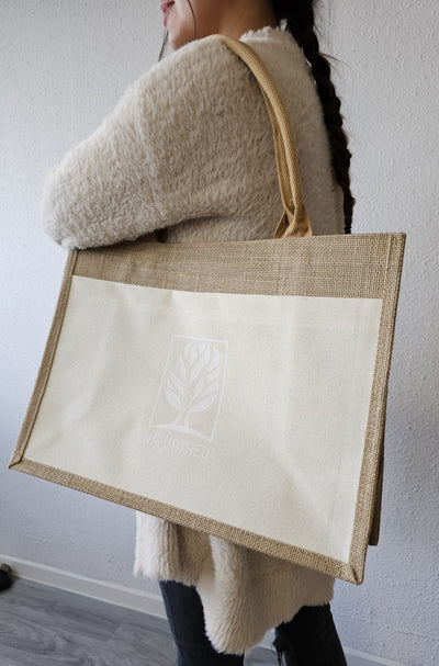 Die Tasche besteht von außen aus 100 % reißfester Jute und dank der Beschichtung von innen kann sie auch schwerere Lasten bis zu 8 kg problemlos tragen.