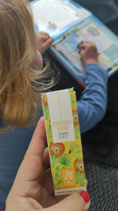 Viele Vitamin D Produkte sind auf Erwachsene ausgelegt und enthalten Dosierungen, die für Kinder zu hoch sind. Bei unserem NATURTREU SONNENKIND handelt es sich speziell um Vitamin D Tropfen für Kinder ab vier Jahren: mit 500 I. E. Vitamin D3 pro Tropfen ist die Dosierung kindgerecht und abgestimmt. Zusätzlich enthalten unsere Vitamin D Tropfen Vitamin K2, das einen wichtigen Beitrag zur Erhaltung normaler Knochen leistet.